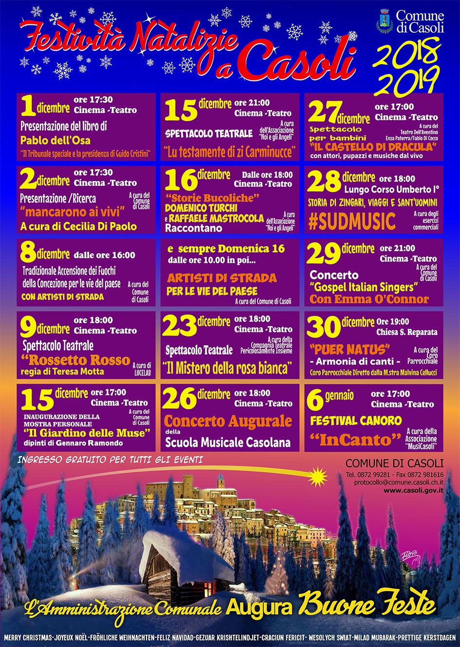 L’Amministrazione Comunale è lieta di annunciare il calendario degli eventi natalizi 2018-2019 in programma a Casoli.