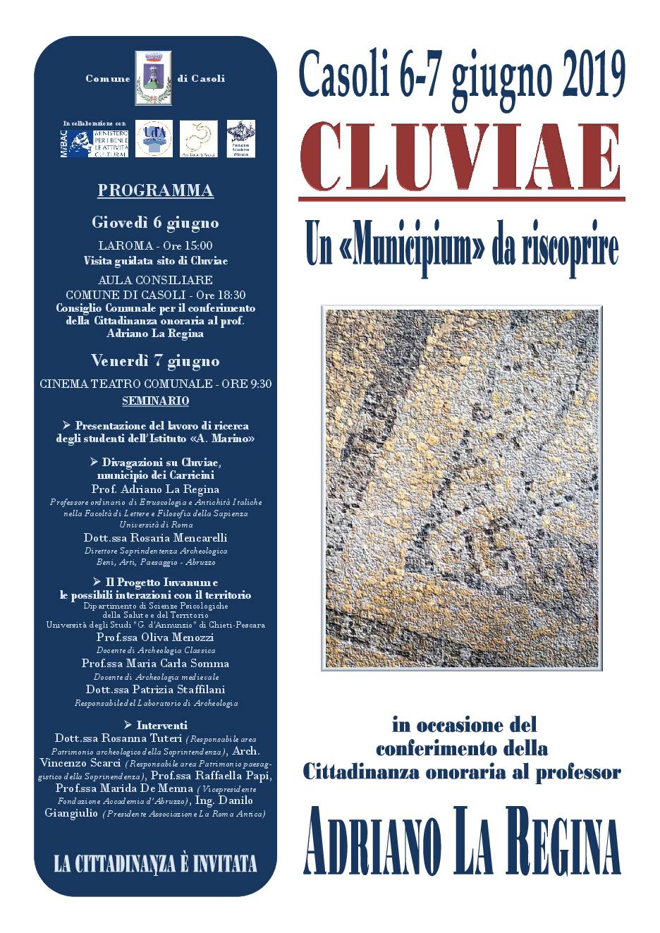 CLUVIAE – Un “Municipium” da riscoprire: programma degli eventi organizzati a Casoli il 6 e 7 giugno 2019 in occasione del conferimento della Cittadinanza onoraria al prof. Adirano La Regina.
