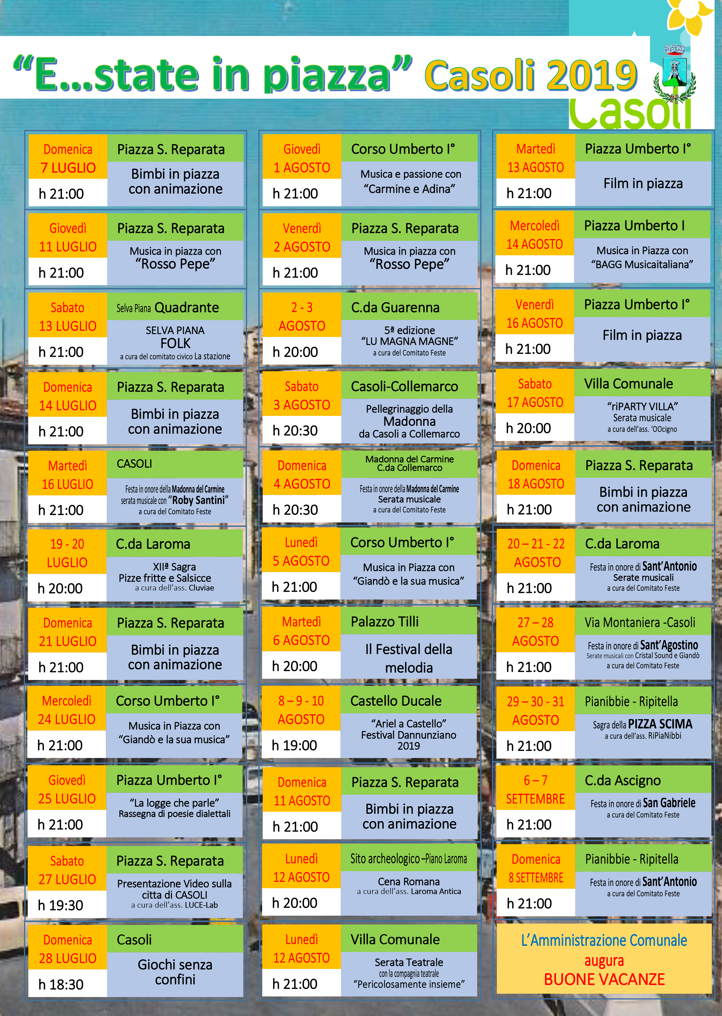 L’Amministrazione Comunale è lieta di presentare il manifesto degli eventi in programma a Casoli per l’estate 2019.