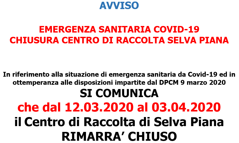 Emergenza Coronavirus: chiusura Centro di Raccolta in loc. Selva Piana