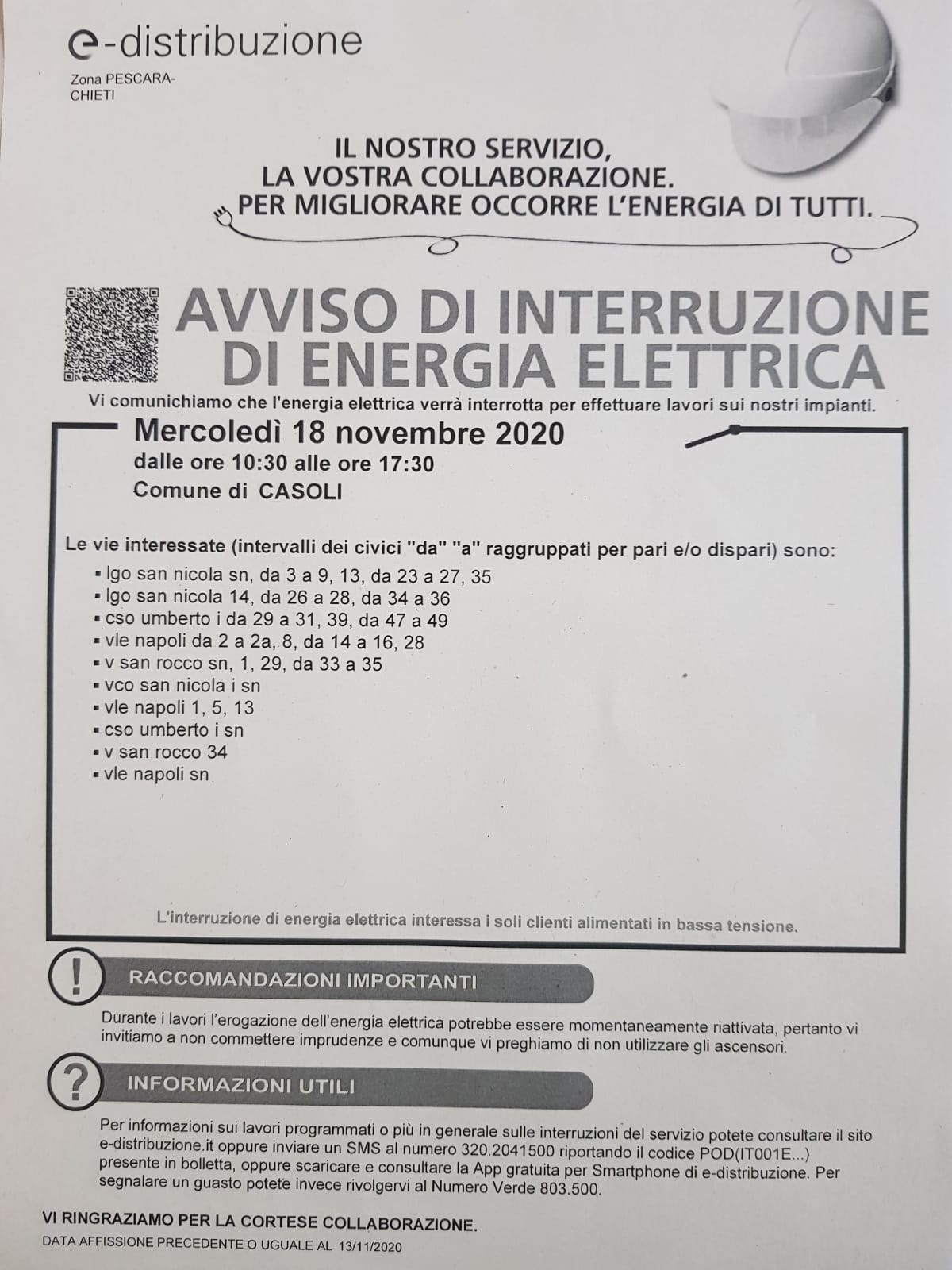 Interruzione energia elettrica nel giorno di martedì 18 novembre 2020