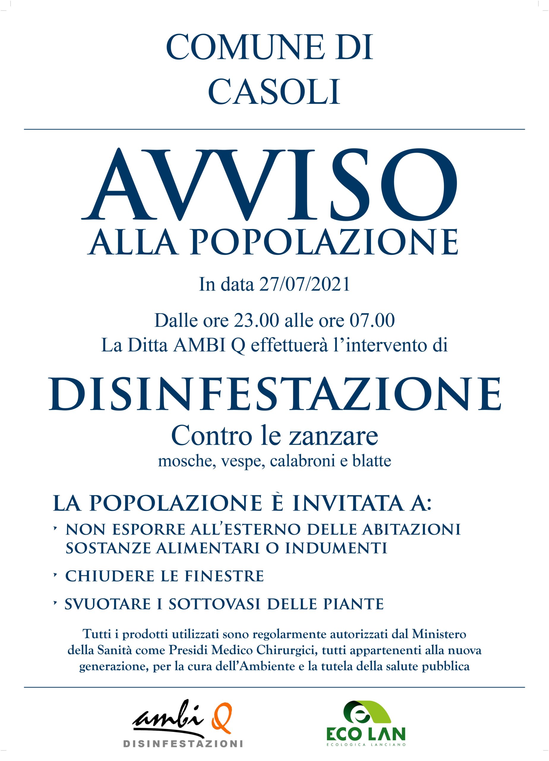 In data 27/07/2021, dalle ore 23:00 alle ore 07:00, la ditta AMBI Q effettuerà l’intervento di disinfestazione contro le zanzare, mosche, vespe, calabroni, artropodi e blatte.