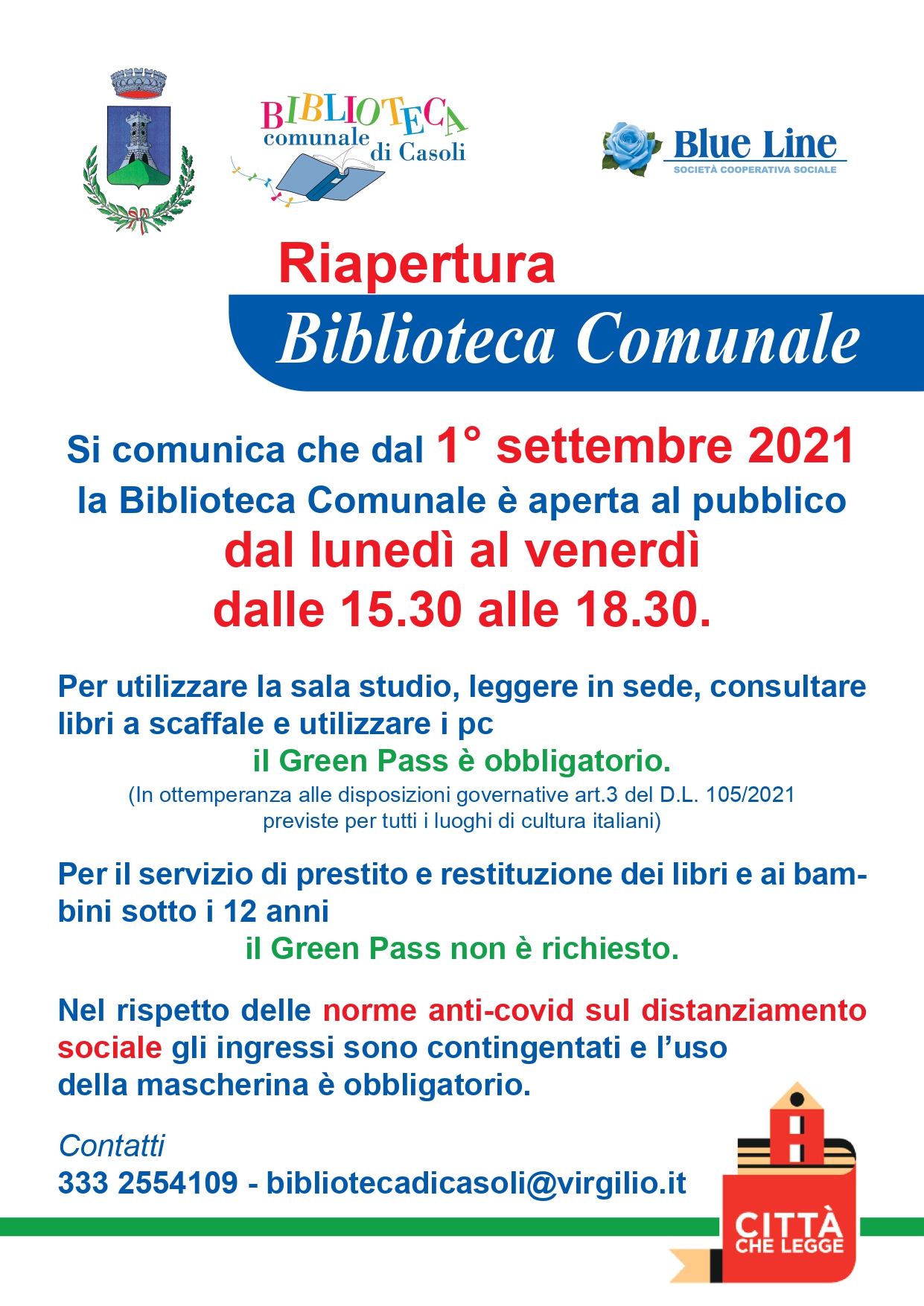 Si comunica che dal 1° settembre 2021 la Biblioteca Comunale è aperta al pubblico.