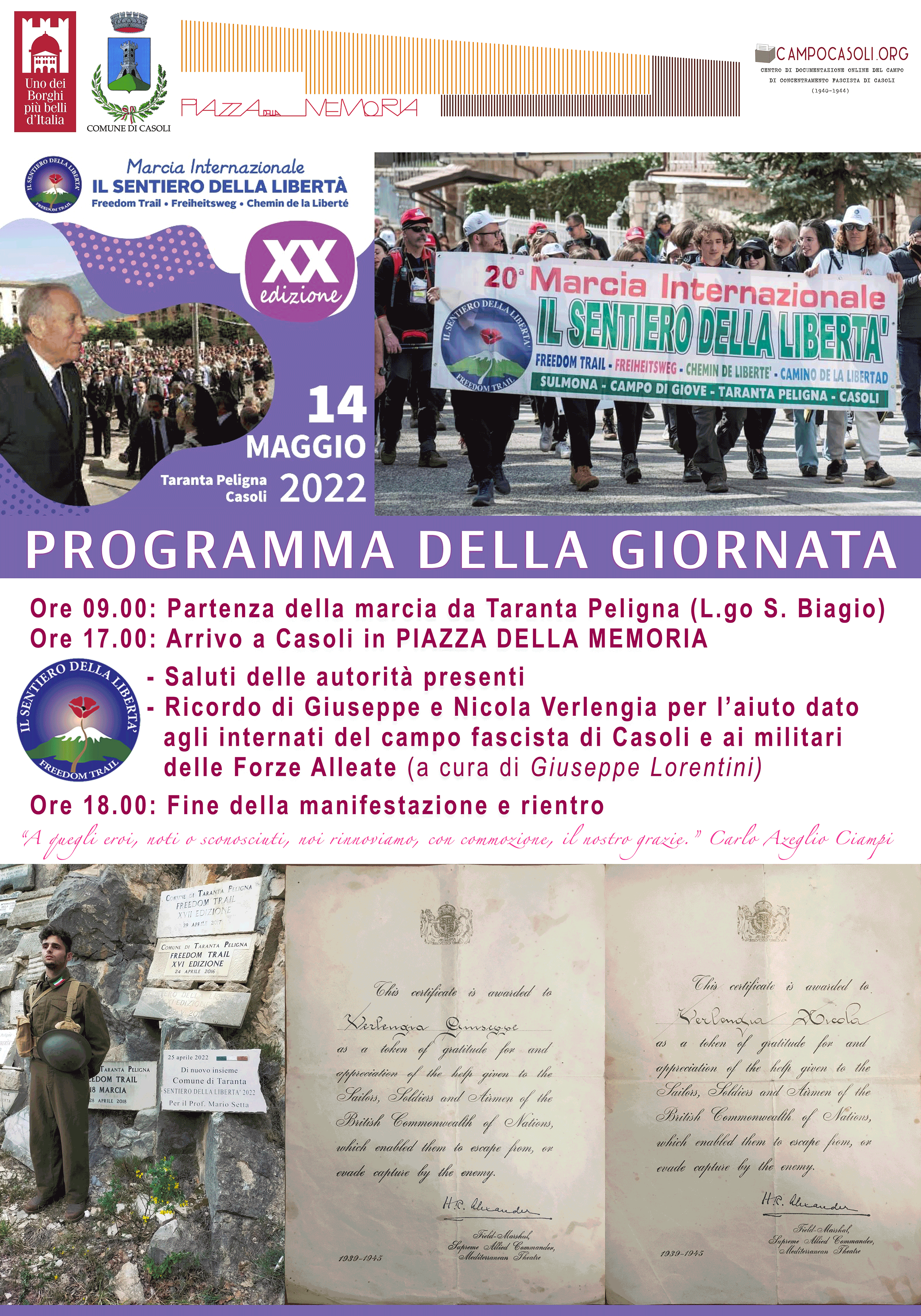La XX edizione della marcia internazionale “Sentiero della libertà” arriva a Casoli! Sabato 14 maggio 2022, partenza alle ore 09:00 da Taranta Peligna. Arrivo a Casoli, in Piazza della memoria, alle ore 17:00.