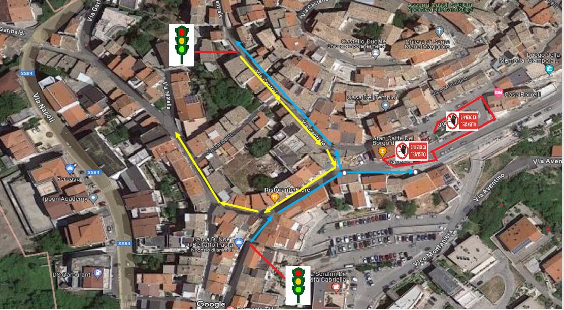 Per chi necessita di accedere o uscire dal centro storico, sarà istituito un senso unico alternato di circolazione veicolare, regolato da semaforo, in Via Centrale e Corso Vittorio Emanuele da domani giovedì 18 gennaio 2024.